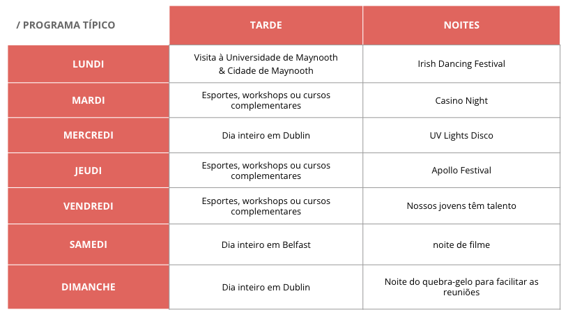 O programa de atividades permite que você se exercite com o esporte, reflita com workshops, aprenda inglês mais rápido com cursos opcionais, mas também aproveite Dublin com dois dias completos de excursão! Difícil fazer mais equilibrado como um programa.