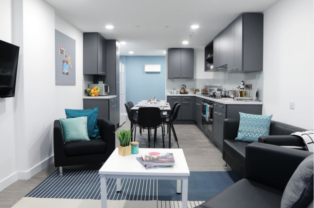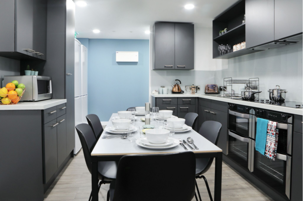 Accès cuisine équipée, laverie et salon/salle à manger en commun